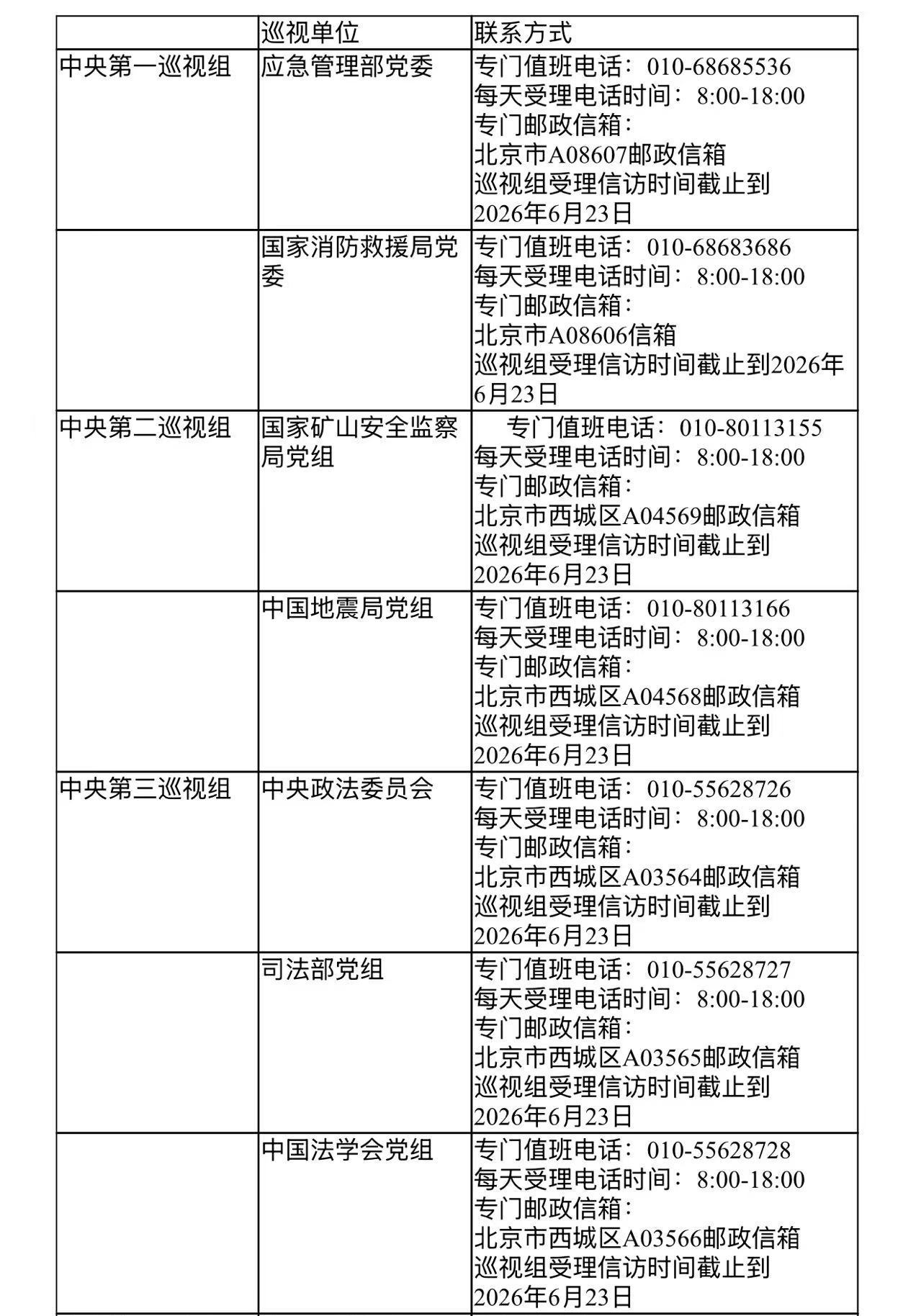 已进驻中央巡视组联络方式: